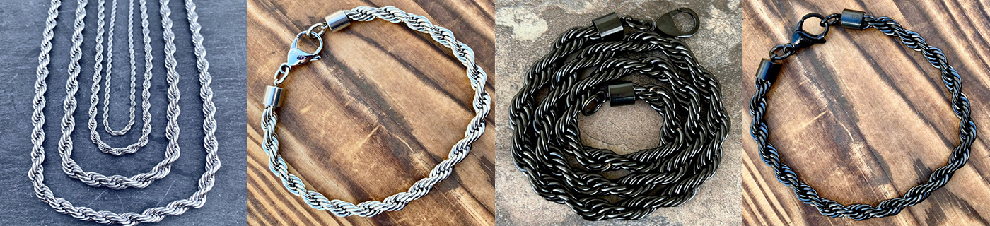 A collection Sanity's Cuban Link, Figaro, and Classic Rope Chains.